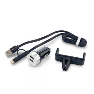 Landik trae este producto para cargar la bateria de tu dispositivo móvil en el carro, este completo kit trae: – Adaptador de corriente para carro con dos puertos para conexión USB. – Cable 2 en 1: Cable micro USB y cable tipo C – Soporte ajustable para celulares para la rejilla del ventilador del carro….