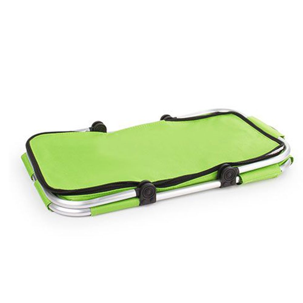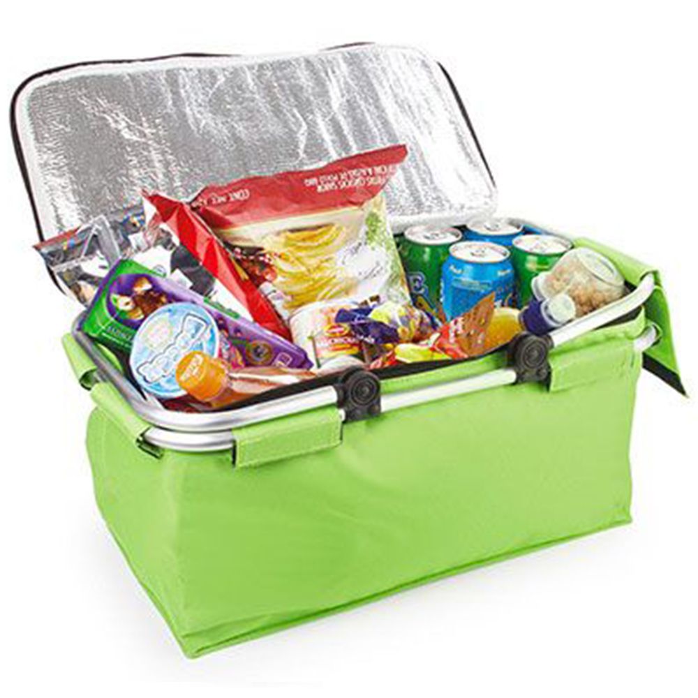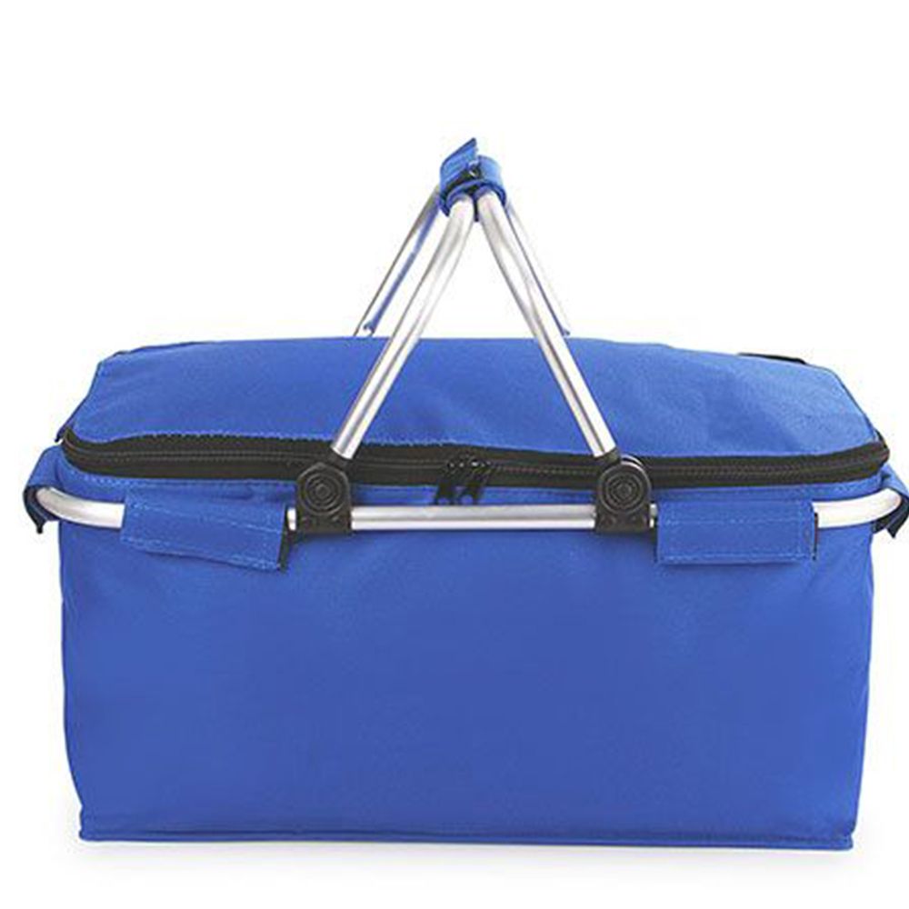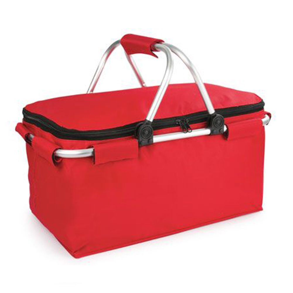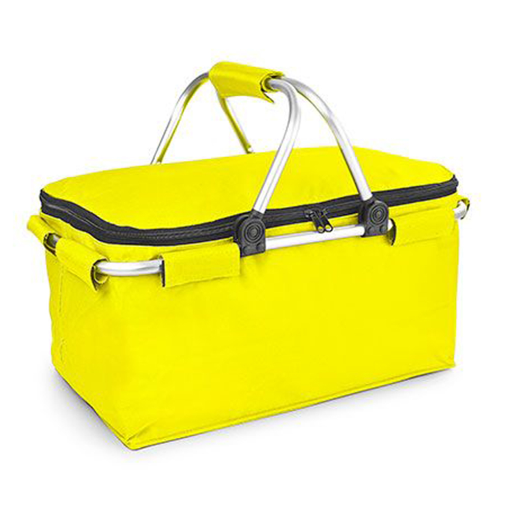 Esta canasta esta fabricada en lona poliester, tiene agarraderas en aluminio para facil transporte y revestimiento interior (forro) en aluminio que ayuda a mantener un poco mas la temperatura de tus alimentos y/o bebidas. Además es plegable para guardar facilmente sin pcupar mucho espacio.