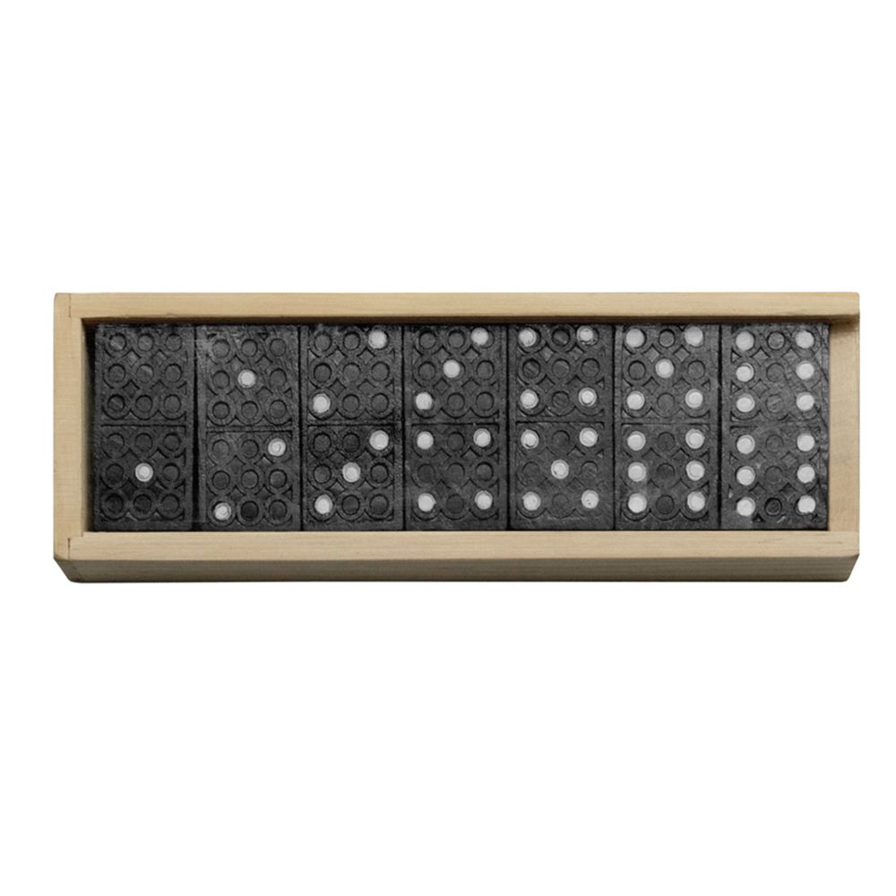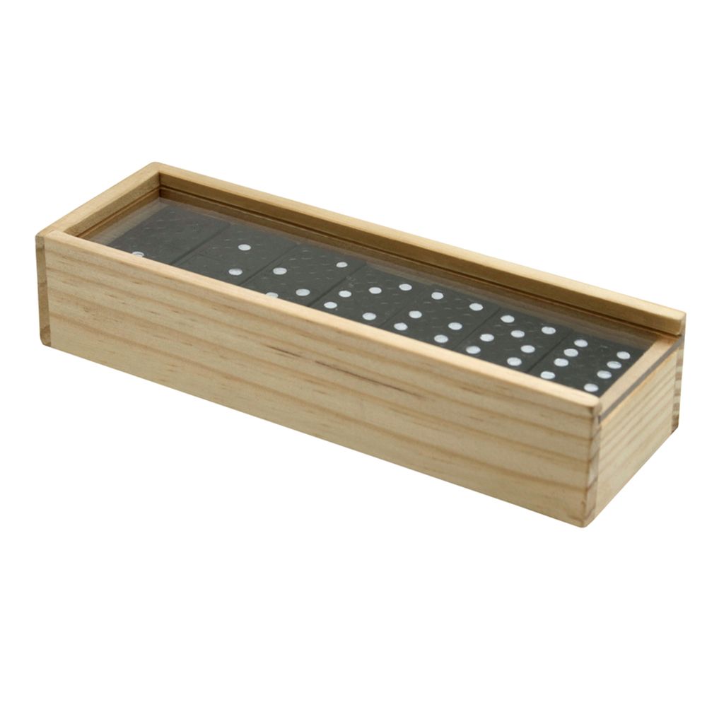 15 x 5 x 3 cm. Plástico y madera. Juego de domino con 28 piezas plásticas, caja de madera y tapa plástica transparente.