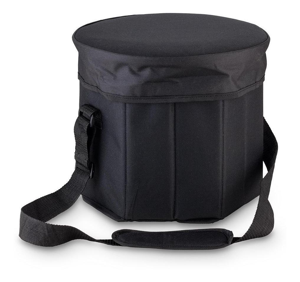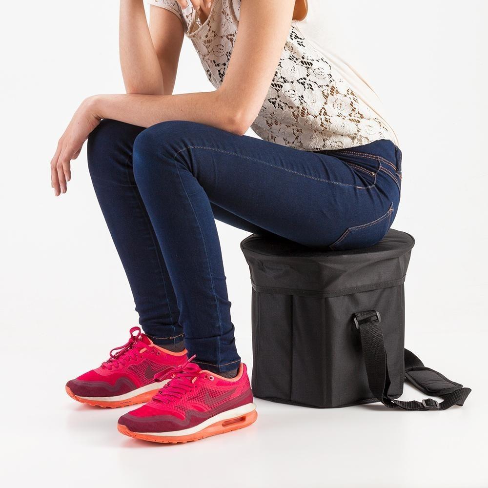 Fabricada en poliéster con base interna y tapa que sirve como silla al estar armado y cerrado.