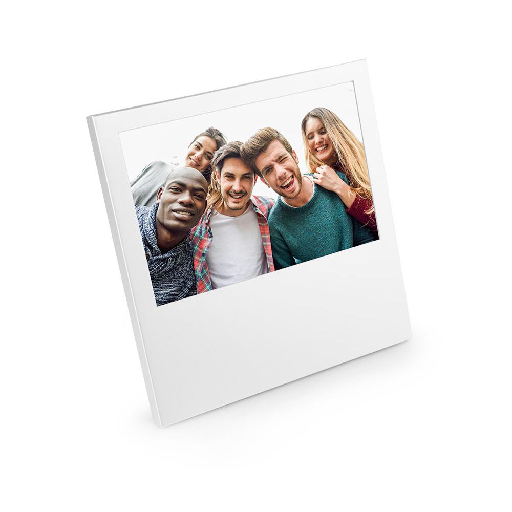 Tiene un diseño cuadrado con la foto en la parte superior, es tamaño mediano de 16cm x 16cm.