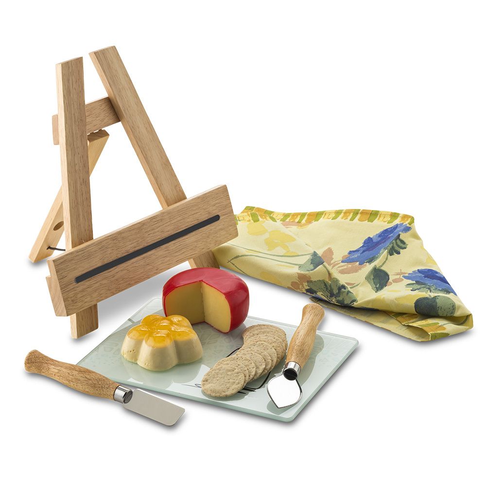 Landik trae este set de queso en vidrio con base en madera con forma de caballete, trae tambien dos accesorios para quesos y tiene imán para colocar los accesorios en el caballete.