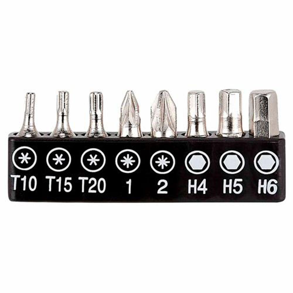 16 puntas para desarmador. (3 puntas en cruz, 4 puntas planas, 1 adaptador, 3 puntas Torx con seguro (T10, T15, T20) 2 de estrella y 3 puntas hexagonales(H4, H5, H6))