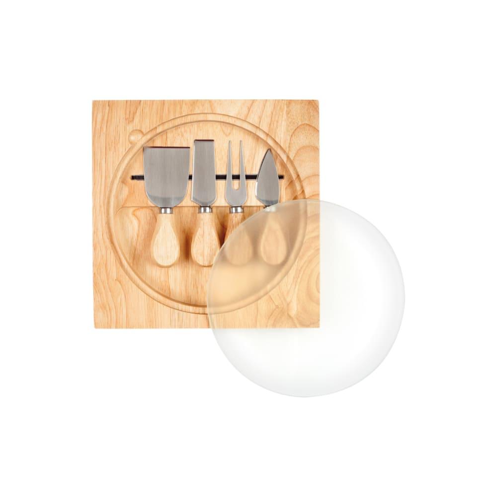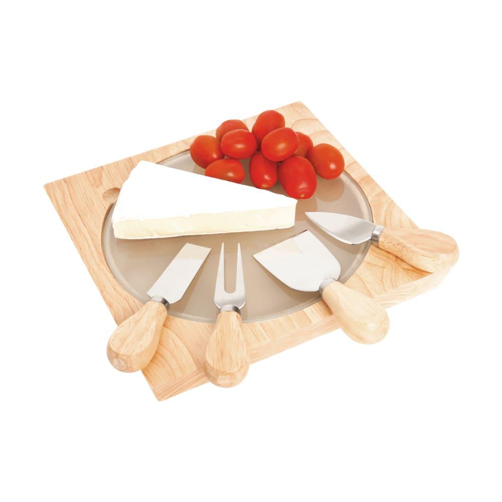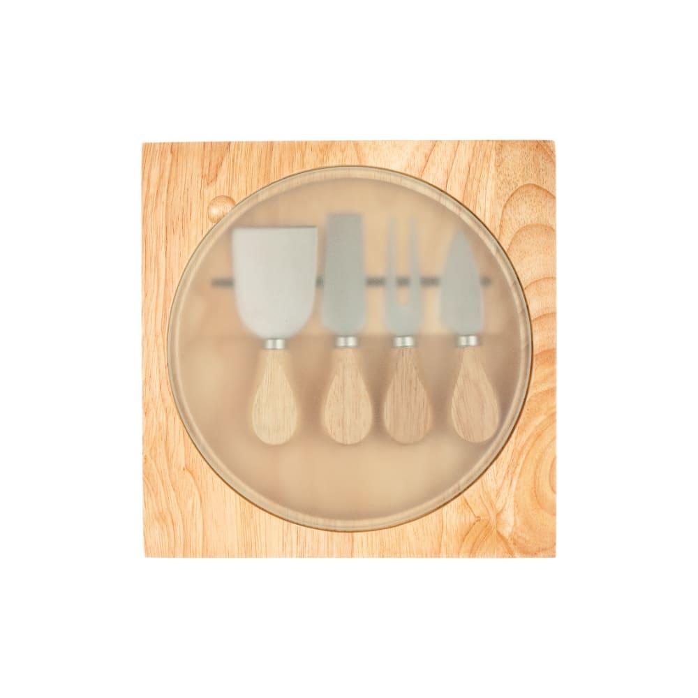 Landik trae para ti esta tabla de quesos en madera, en la parte interna contiene un imán que sostiene 4 utensilios para quesos en acero inoxidable y mango de madera. Tabla circular de vidrio esmerilado de diametro 20 cm.