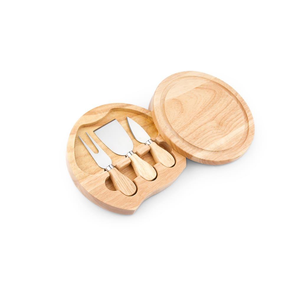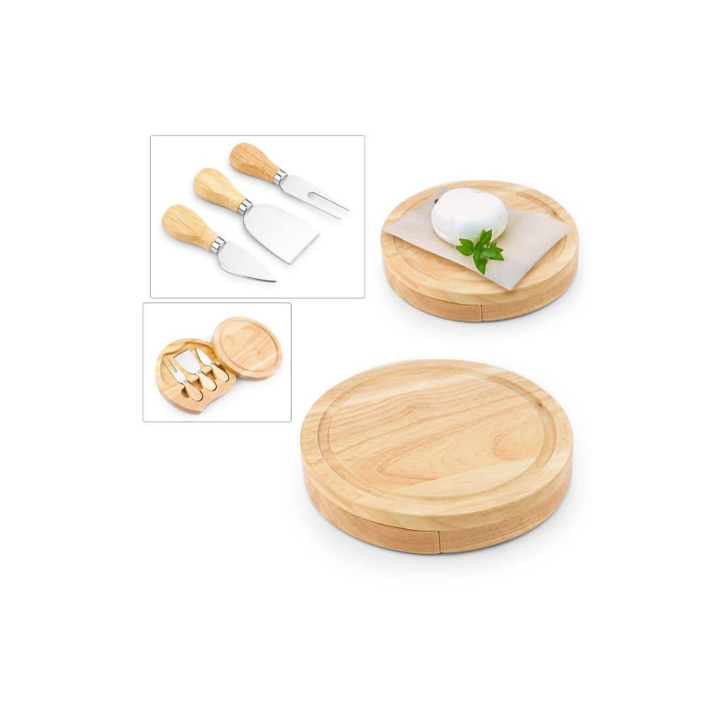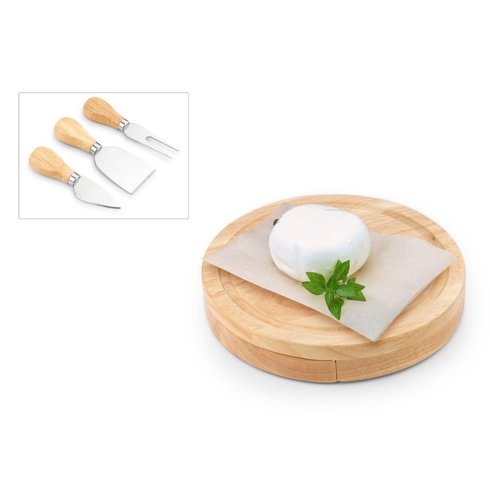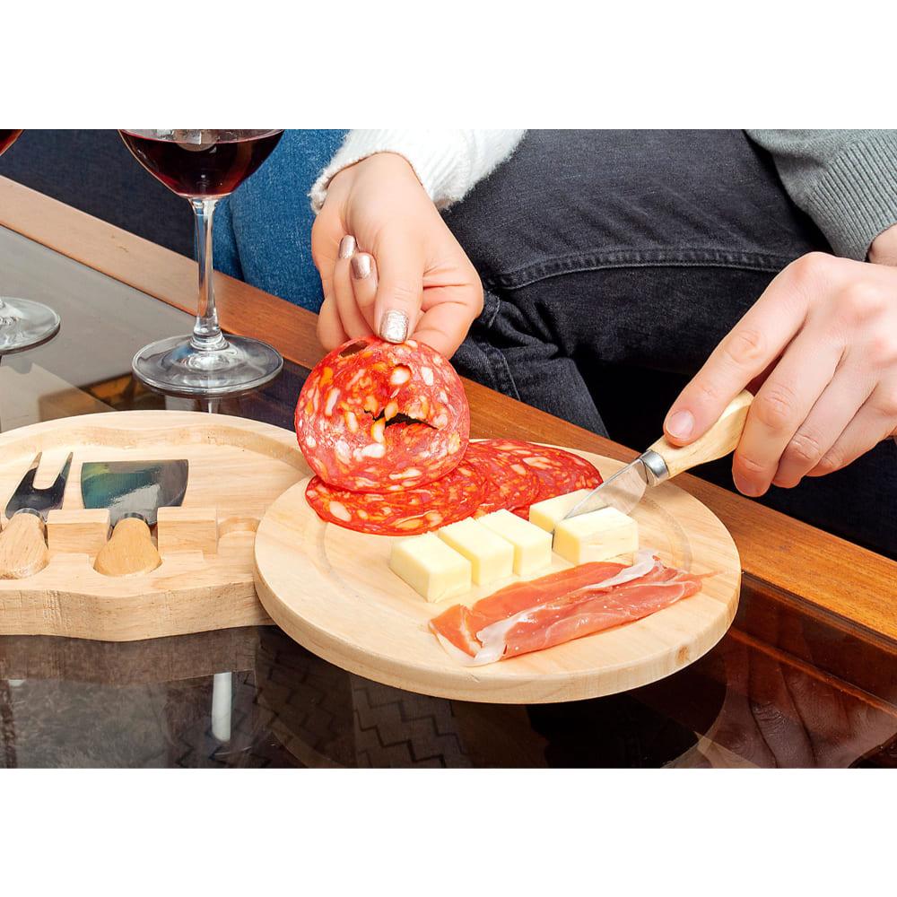 Landik trae para ti esta tabla de quesos redonda con 3 Cuchillos: Cuchillo para parmesano, quesos duros y Tenedor. Lavar con agua y jabón y secar al aire libre.